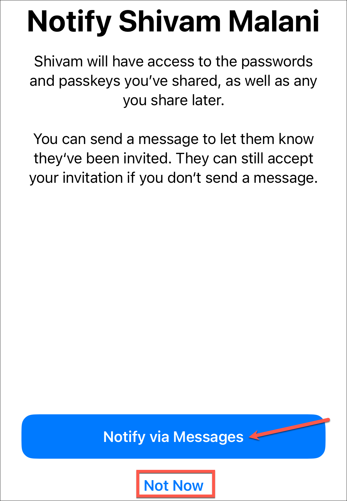 Finally, choose whether you want to notify the people you've invited to the group by sending them a message. Even if you don't message them, they can find and accept your invitation from Passwords. They will have to accept the invitation for them to become a part of the group, though.