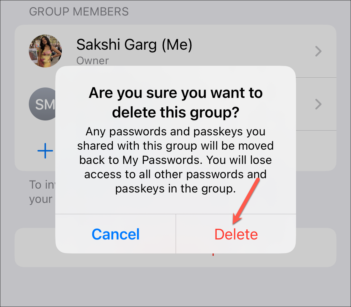 You can also delete the group entirely. Any passwords you shared with the group will be moved back to your passwords, but you'll lose access to passwords and passkeys shared by others. Tap 'Delete Group' at the bottom.