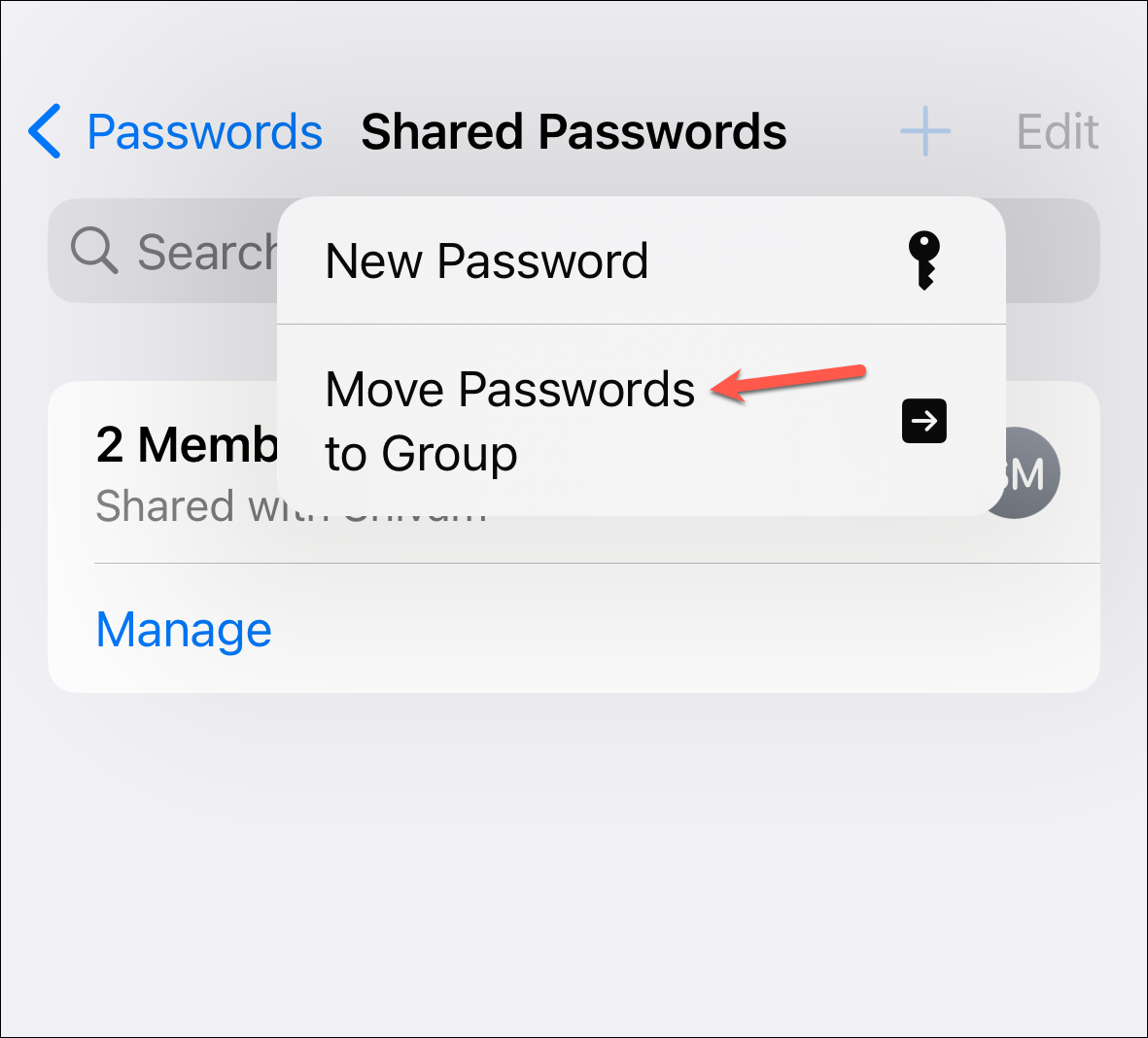 To share a previously saved password from your iCloud Keychain, select 'Move Passwords to Group' from the options.