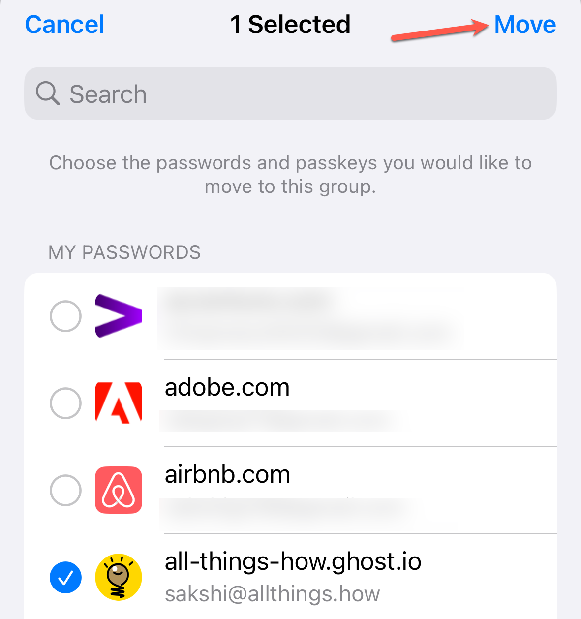 Then, select the password(s) you want to share and tap 'Move'.