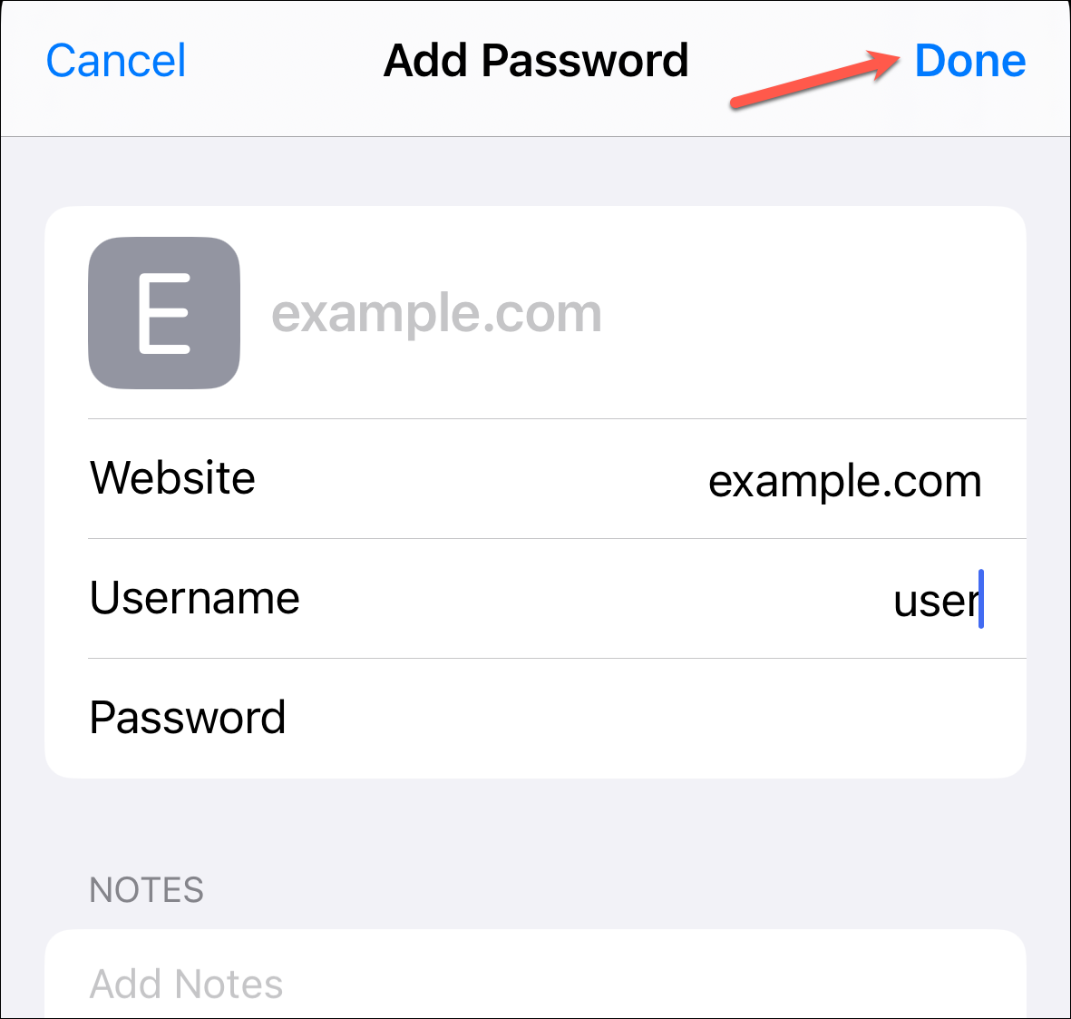Then, enter the details, i.e., website, username, and password, and tap 'Done' to add the password.