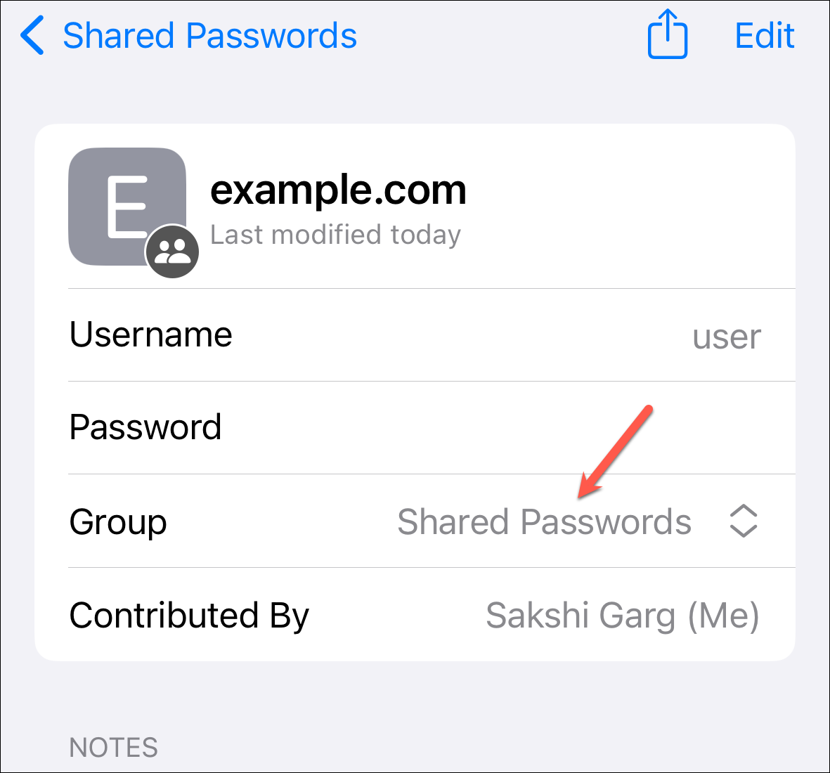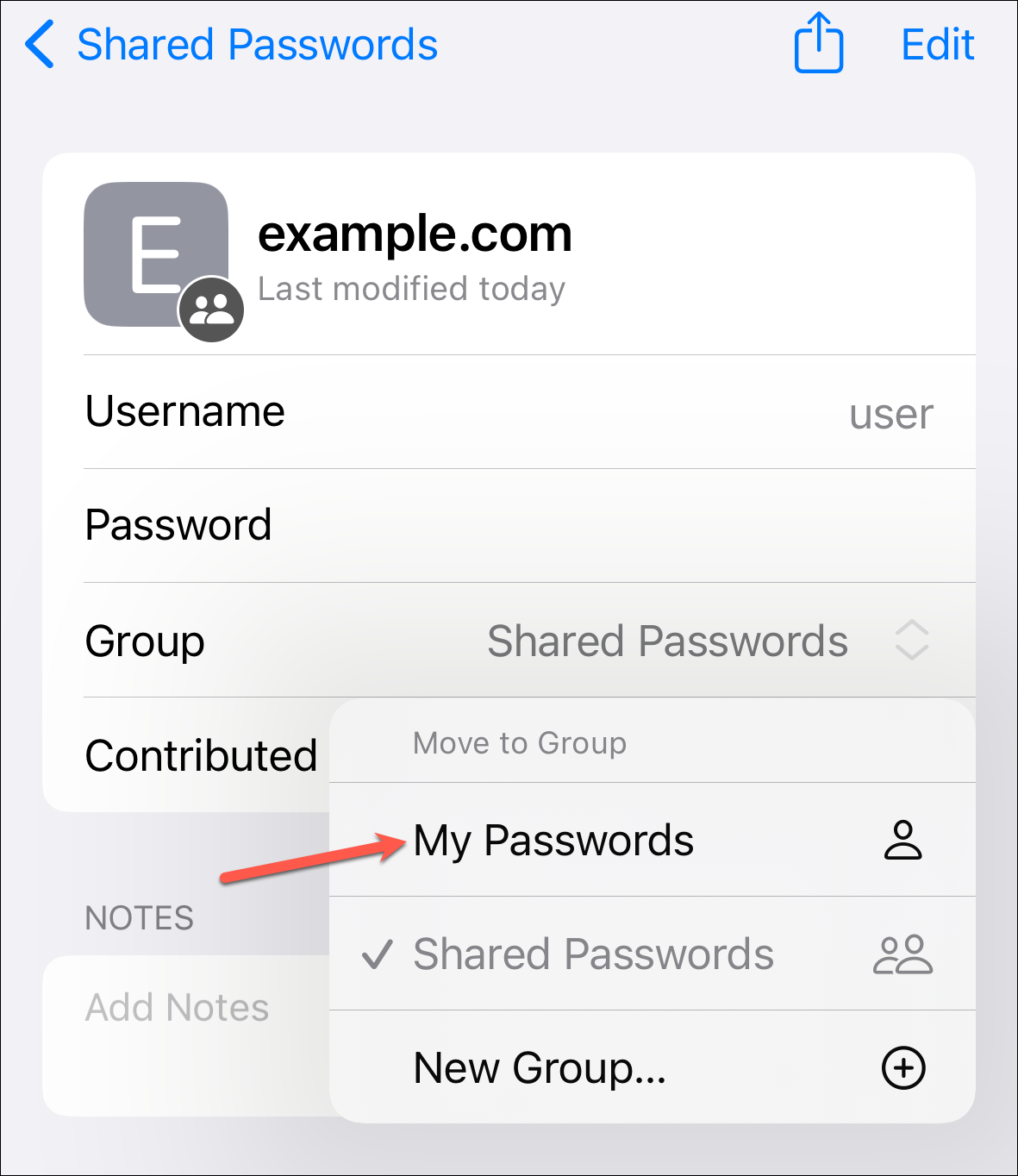To move the password back to your passwords from the group, tap the drop-down menu next to 'Group'.