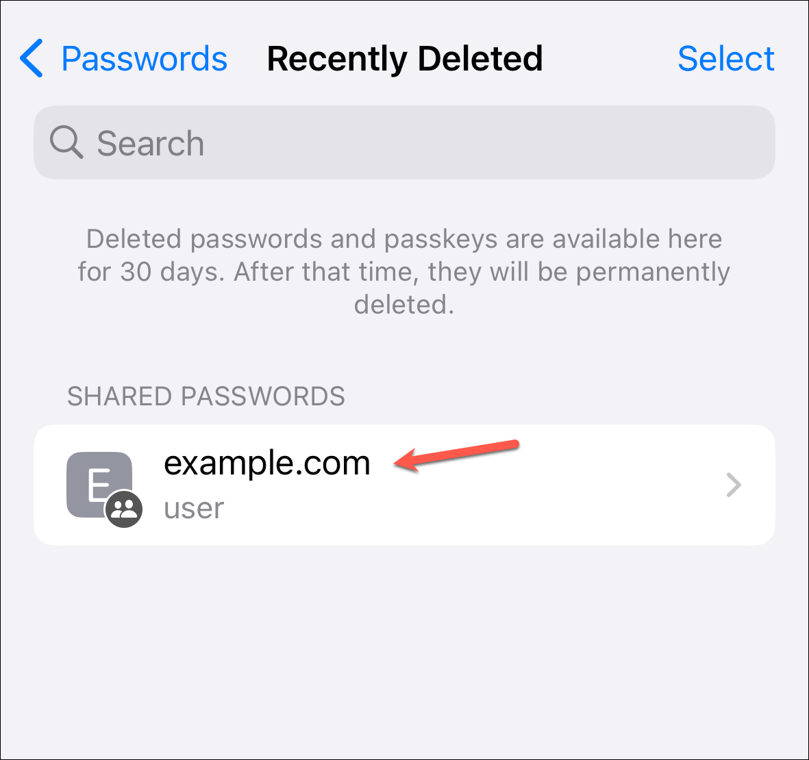 Go back to Passwords and tap the 'Recently Deleted' folder.