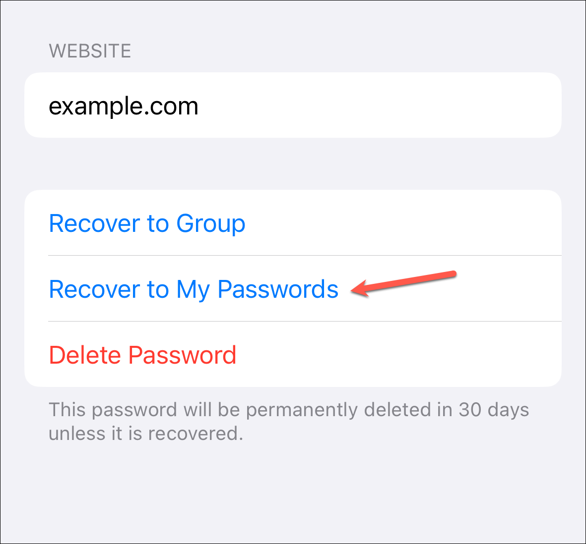 You can either choose to restore it to the group or tap 'Restore to My Passwords' to move it to your personal iCloud keychain.