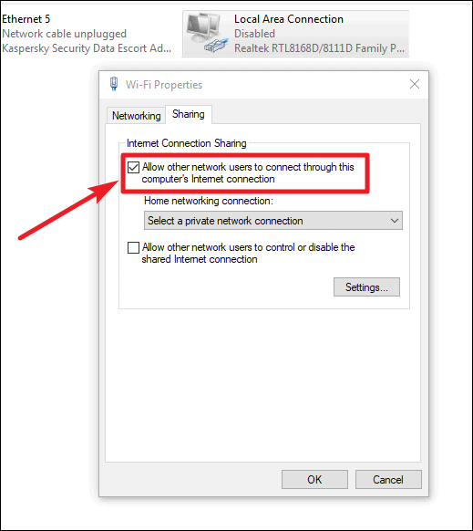 Then right-click again on the ethernet adapter that we previously disabled, and select Properties from the context menu. Then click on the Sharing tab and enable Internet Connection Sharing and select the needed services from Settings.