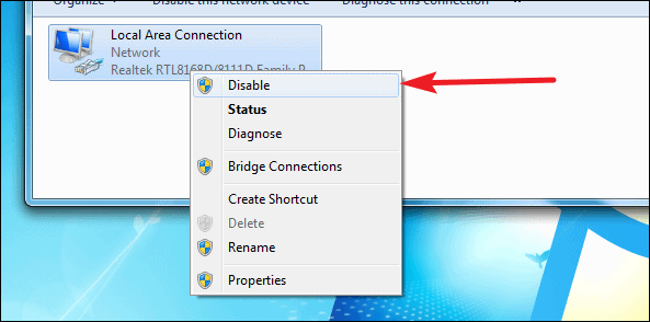Now disable the active ethernet adapter. Right-click on the adapter which is currently being used for the internet on your Windows PC, and select Disable from the context menu.