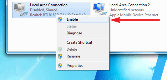 Finally, re-enable the adapter for Internet on your PC. Right-click on it in the Adapter settings and click Enable.