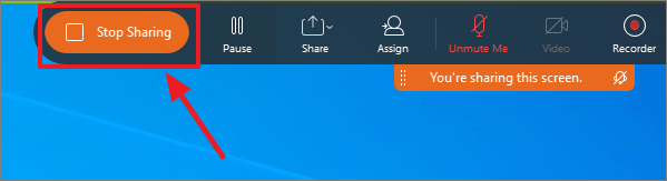 To stop screen sharing move your cursor to the Screen Share toolbar and click on ‘Stop Sharing’. Next to the stop Sharing button is ‘Pause’ button that can be used to pause a screen sharing session.