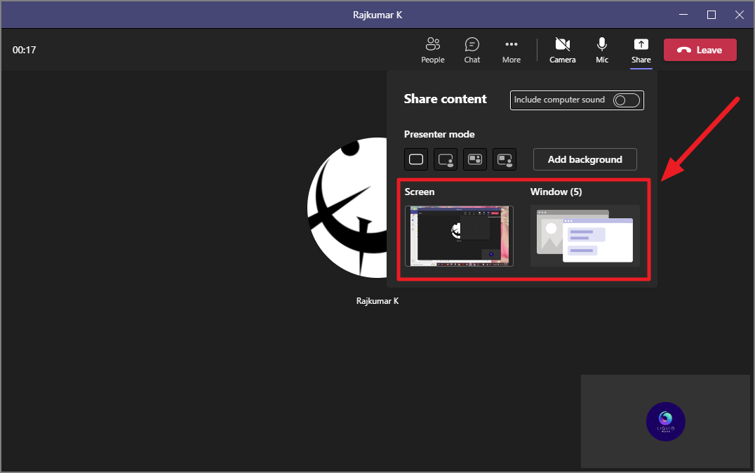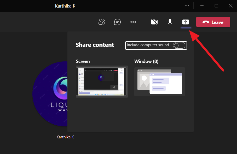After clicking the share screen icon, a section called Share ‘Content’ will open below the icon (right of the Teams interface) with the options for sharing the screen. Now, you will see options to share the entire screen or a window of a specific application.