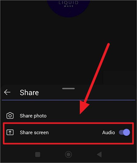Before sharing, toggle the ‘Audio’ option to include the audio in your screen share (optional). Now, tap the ‘Share screen’ option.