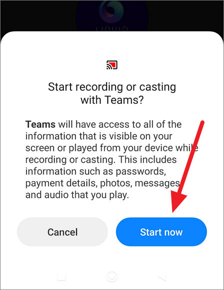 Once you select the ‘Share Screen’ option, a popup will appear. Here, click the ‘Start now’ button.
