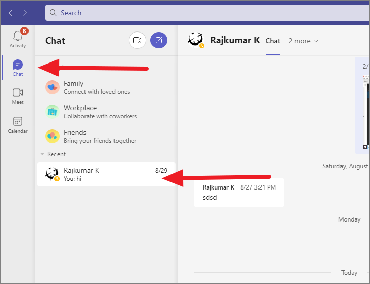 First, click ‘Chats’ on the navigation panel on the left and open a chat screen with a group or person in Microsoft Teams.