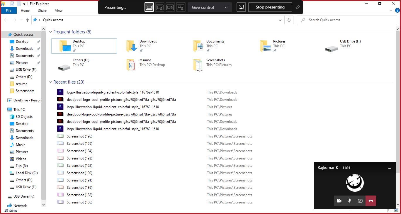 Once you started to share the screen or window, you will see a red border around the shared media letting you which part of your screen is being shared. At the top of your screen, there will be a ribbon with share screen controls. Also, the Teams window will be minimized to the bottom corner of your screen as shown.