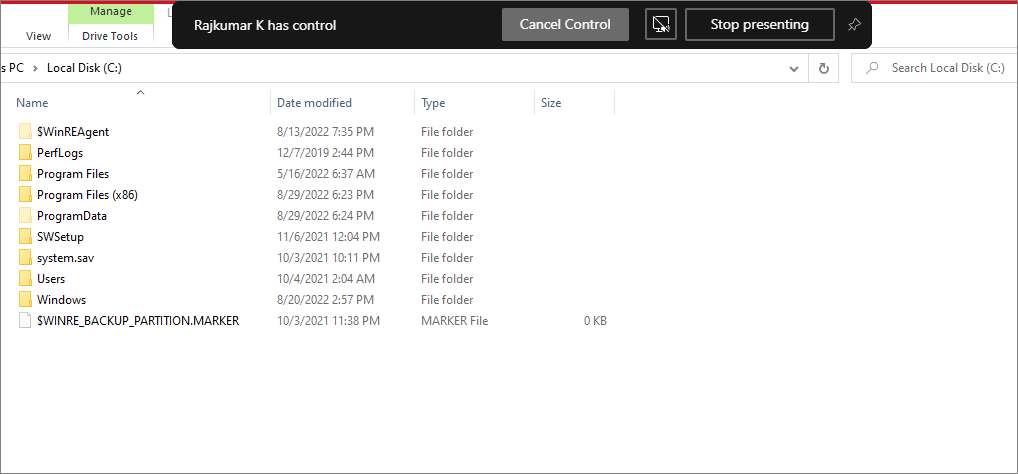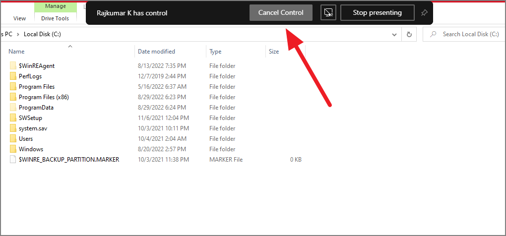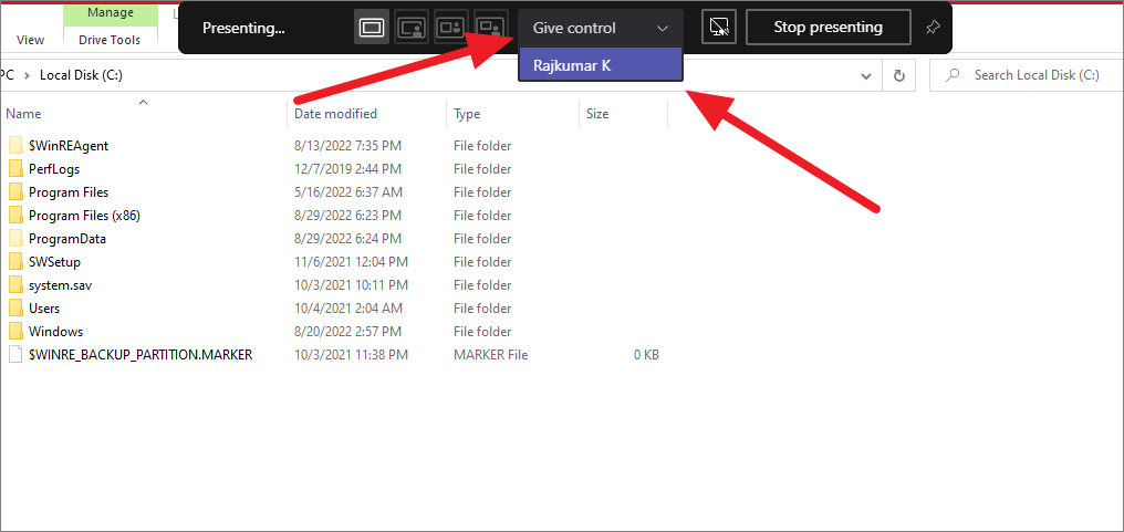 Now, the selected individual will have control over your presentation. In the sharing bar, you can see who has control of your screen.