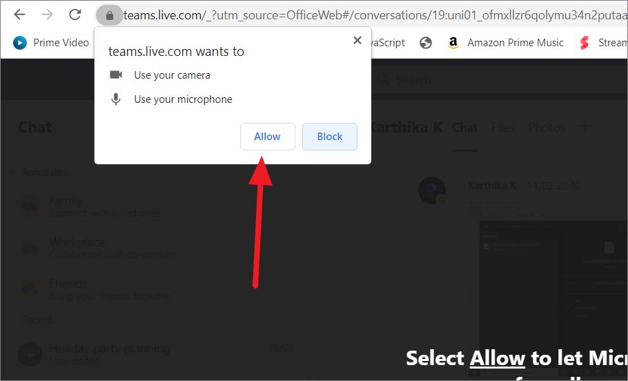 Once you are in the Teams app, join a call or meeting and a pop-up will appear at the top left corner of your browser asking permission to use your camera and microphone. Select ‘Allow’ to let Microsoft Teams use your camera and microphone.