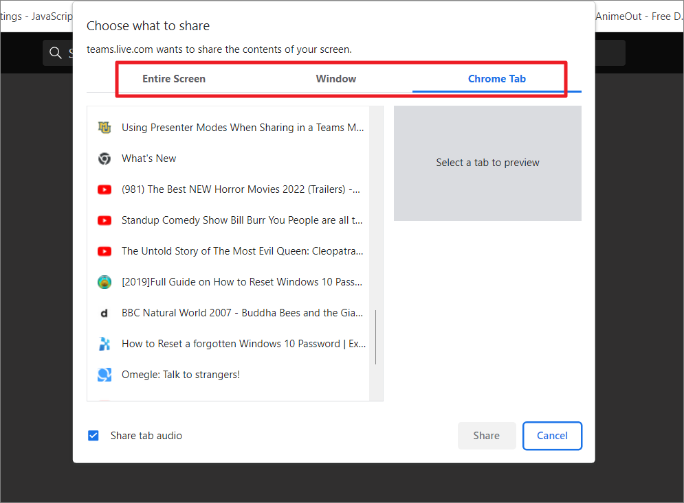 In the pop-up window, choose what you want to share – ‘Entire Screen’, ‘Window’, or ‘Chrome Tab’. Here you can choose to share a particular tab on your browser instead of the whole browser.