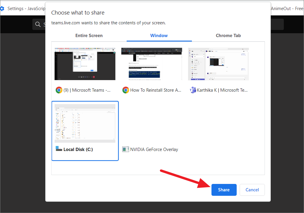 Then, click the ‘Share’ button to start the screen share or presentation and select ‘Screen’ or ‘Window’. If you selected the ‘Window’ option, choose the concerned app window from the list.