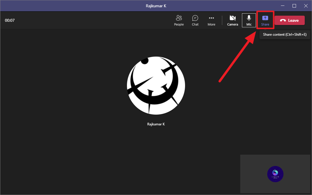 Alternatively, you can also click the share icon (box with an ‘X’ in it) in the minimized Teams window at the bottom corner of your screen.