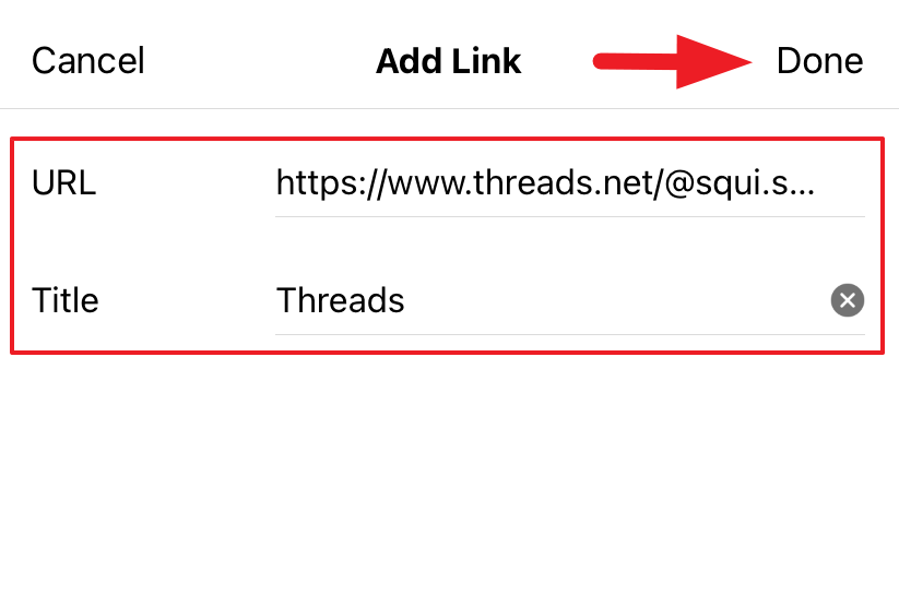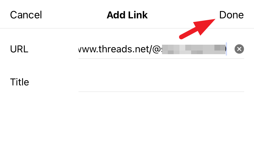 Finally, long tap on the URL field and paste the Threads profile link here. You can also add a title for the link in the field below. Once set, tap 'Done' in the top right corner.
