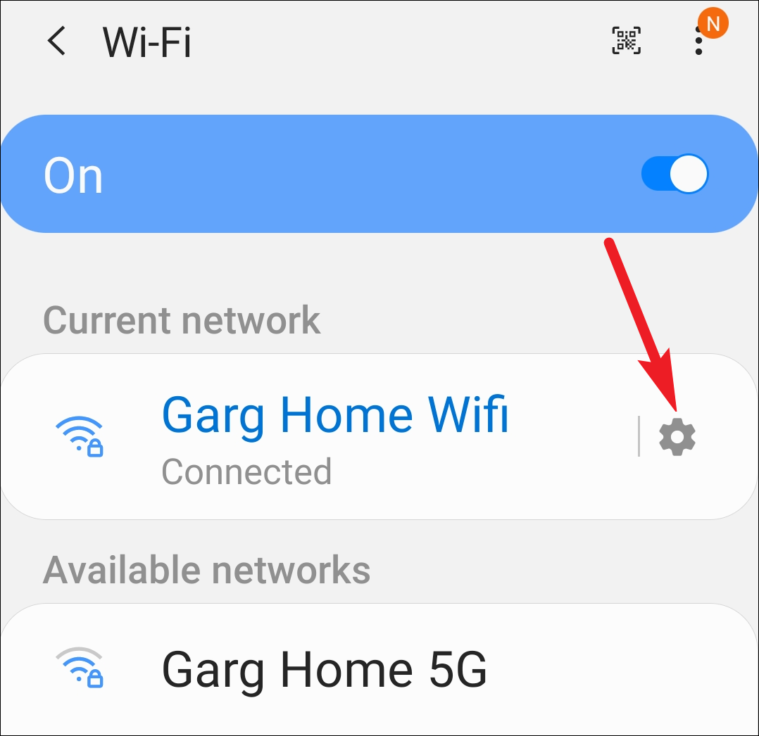 The network you’re currently connected to will be listed at the top. Tap the ‘setting’ option (gear icon) on the right of the said network.