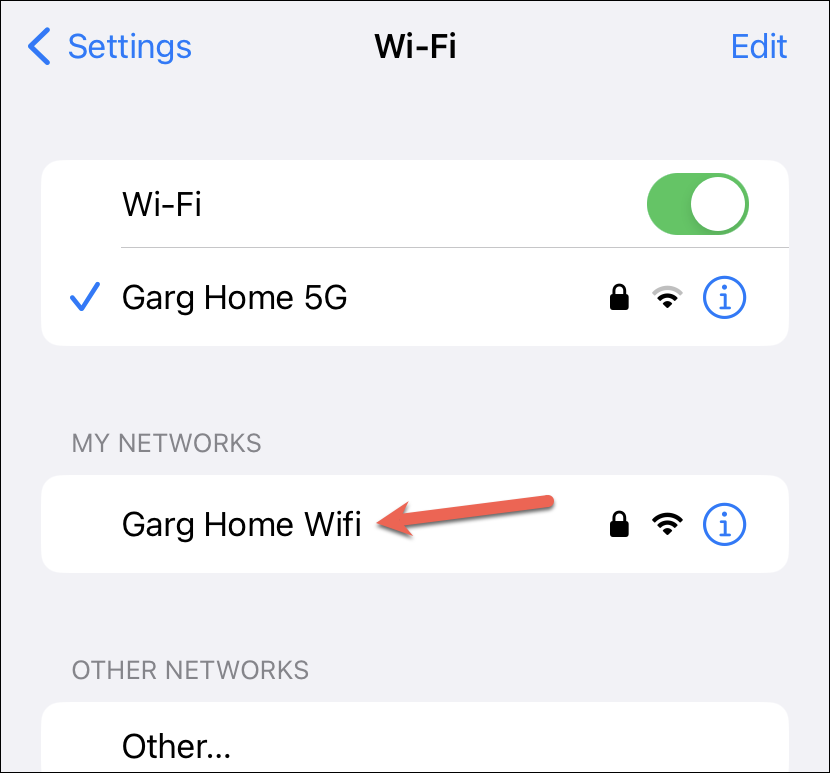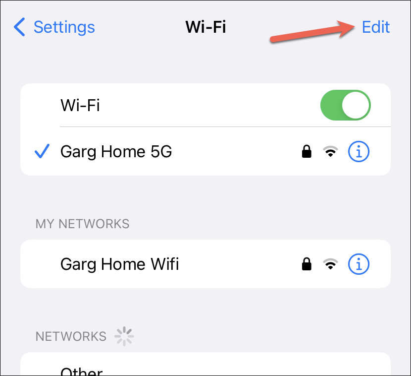 If you’re not currently connected to the network but it is saved on your device, then tap ‘Edit’ in the top-right corner.