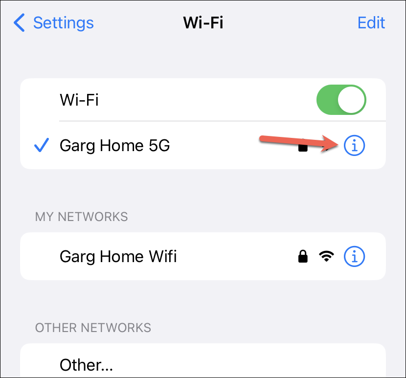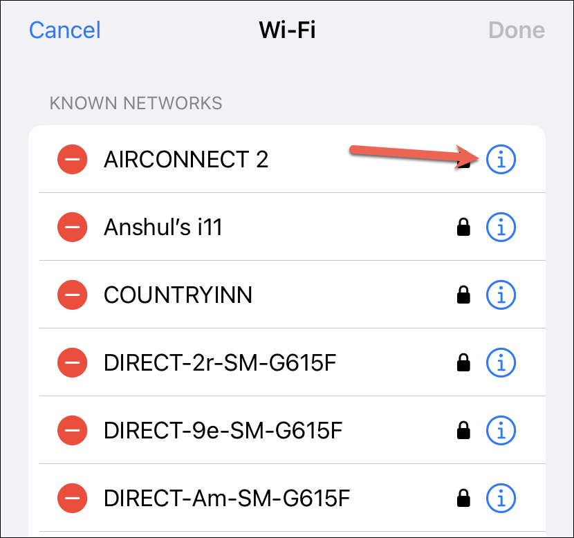 Face/ Touch ID or passcode authentication will be again required to access the saved networks. Find the network from the list and tap ‘i’ in the far-right corner.