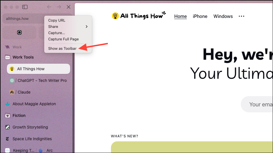 The URL Bar in the Arc Browser is housed in the sidebar by default, which is a radical adjustment for some people. Arc Browser previously implemented the option to show the toolbar at the top of websites like the traditional browser.