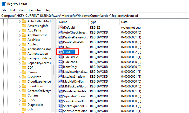 Note: If you cannot find the Hidden DWORD, you will need to create it as described.