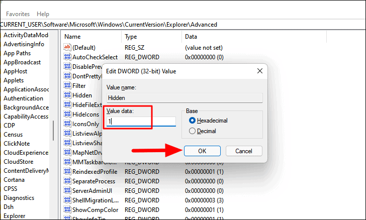 2to1and click OK. A value of1shows hidden files, while2hides them.