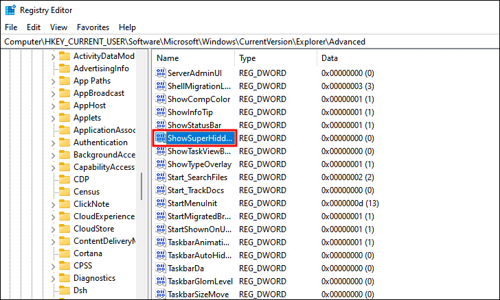 Note: If the ShowSuperHidden DWORD is not present, you'll need to create it.