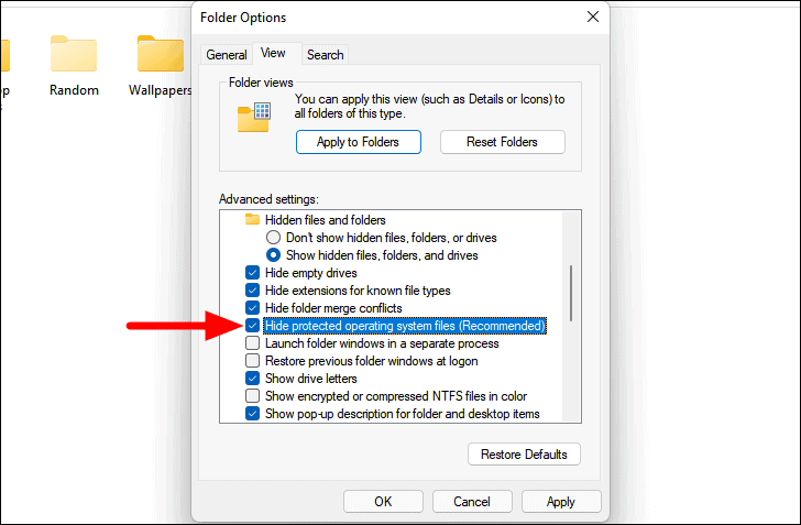 - In the same View tab of the Folder Options, scroll down to find Hide protected operating system files (Recommended).