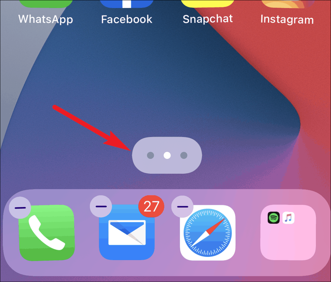 To hide Home screen pages, enter the jiggle mode on your iPhone by long pressing either an app or empty space on your Home screen. Then tap the dots that indicate the number of home page screens just above the dock.