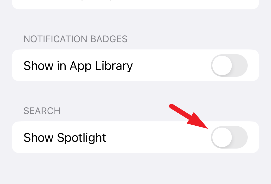From the Home Screen settings, locate the ‘Show Spotlight’ option present under the ‘Search’ section and tap on the toggle switch next to it to bring it to the ‘Off’ position.