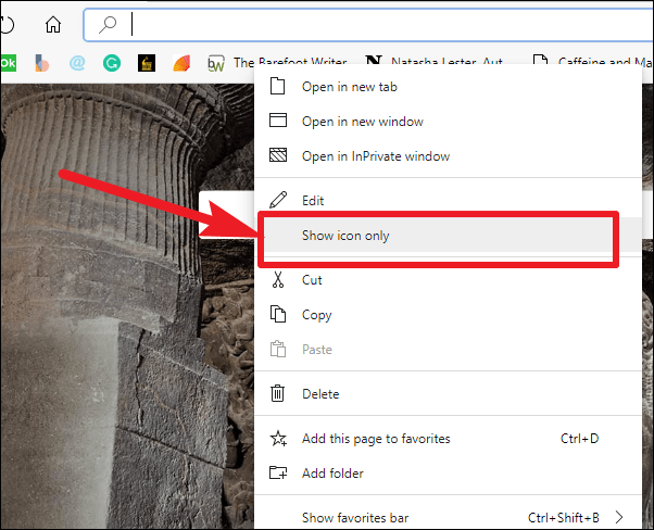 Step 1: Right-click on the favorite or bookmark in your Favorites Bar that you want to display as an icon only. From the context menu that appears, select the Show icon only option.