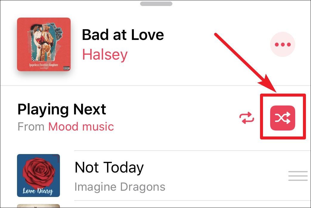 Tap on the ‘Shuffle’ button (the one on the right side of the two buttons) once to turn it on and the entire contents of the ‘Playing Next’ list will shuffle. The button is highlighted when it’s turned on. Tap on it again to turn it off.