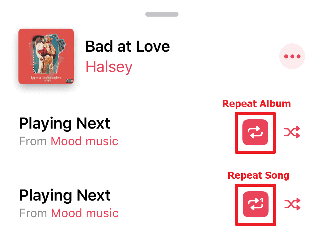 On the ‘Playing Next’ screen, you’ll see the label Playing Next towards the top of the screen. Next to it, on the right side of the screen, will be the Shuffle and Repeat buttons.