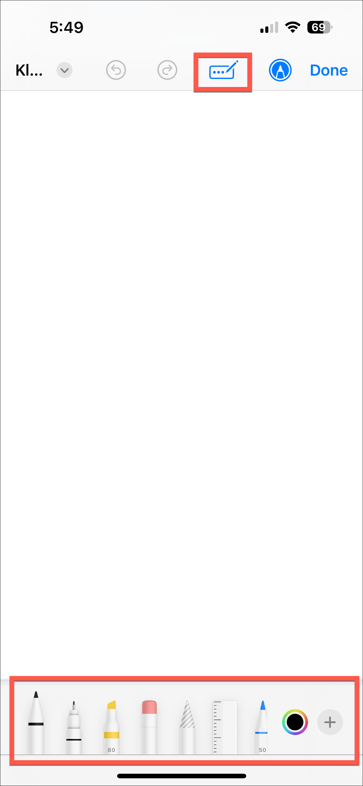 - When you turn on Markup, you will be able to scribble on the PDF using different types of pen tools. You will also see a 'Signature' icon, appearing as a pencil within a rectangle which you need to tap.