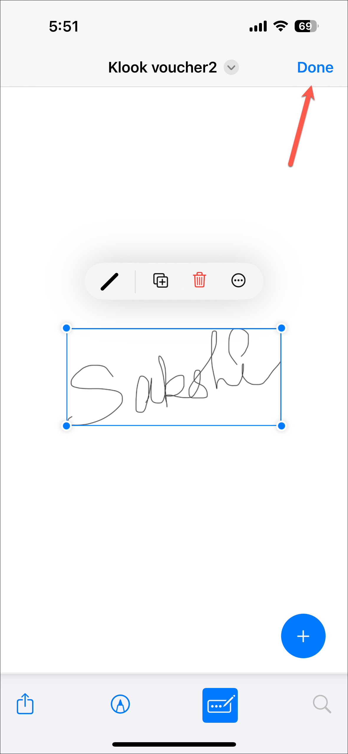 - After making the changes to your signature, you can tap on 'Done' to save all changes or use the Share option to send the signature to other apps or documents.