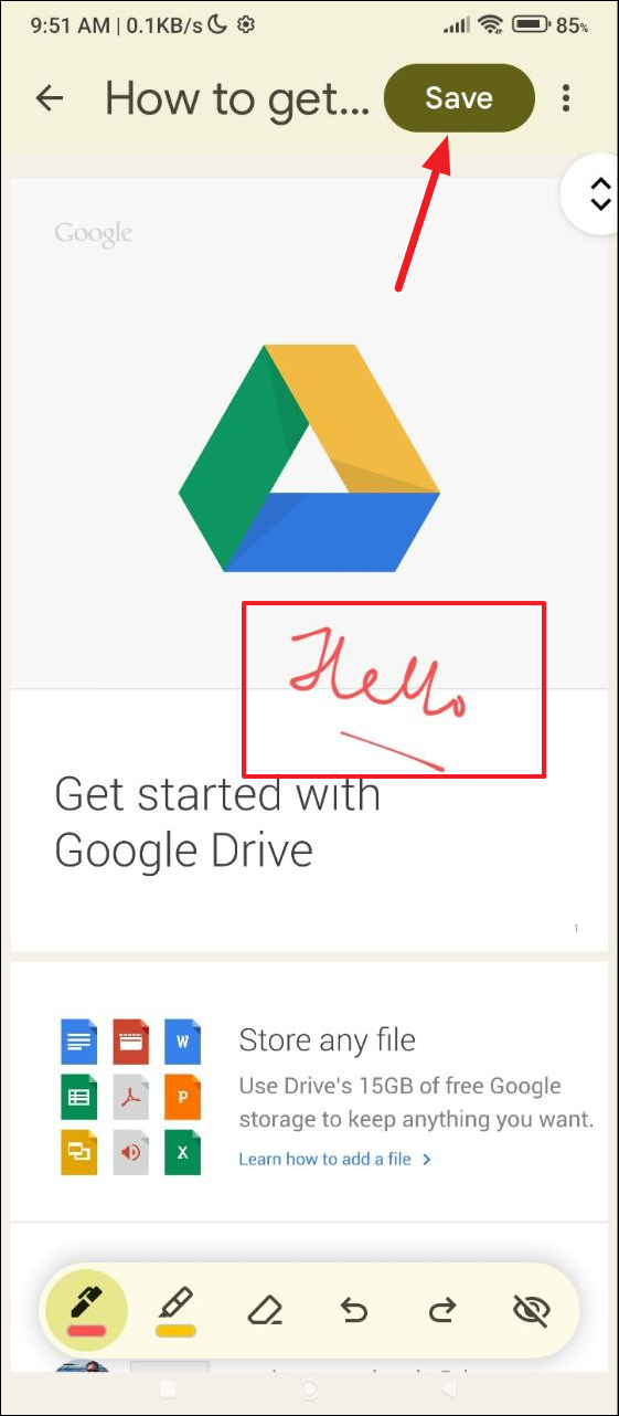 - When you enable the annotate option, the pen tool will become active. You can use it to create a signature manually on the document. Then tap on the 'Save' button at the top to save the document.