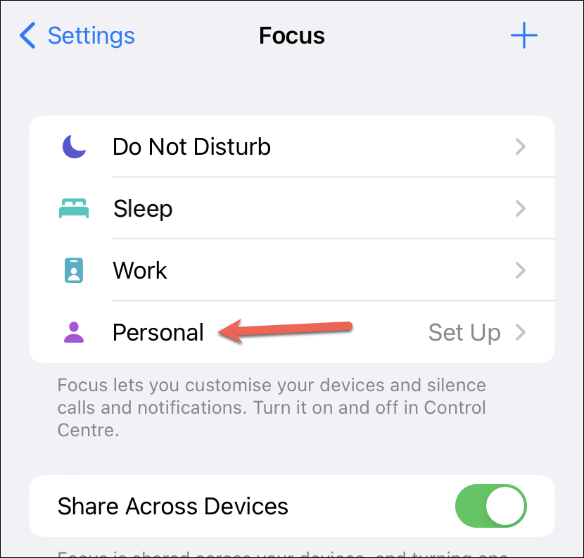 Then, tap the Focus you want to edit or tap a new Focus to set it up. For this guide, we’ll be setting up the ‘Personal’ Focus.