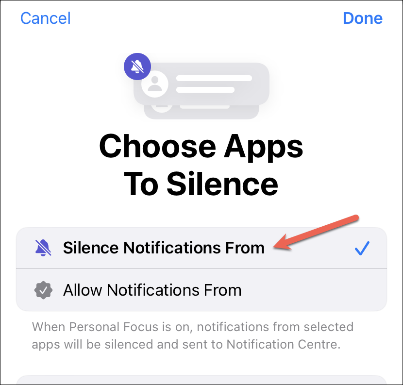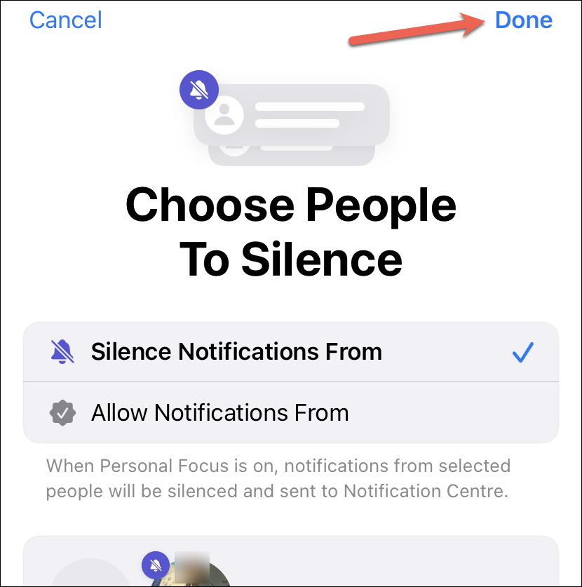 You can either use the silence list to silent notifications from specific apps and people while setting up a new Focus or edit an old Focus to make the changes.