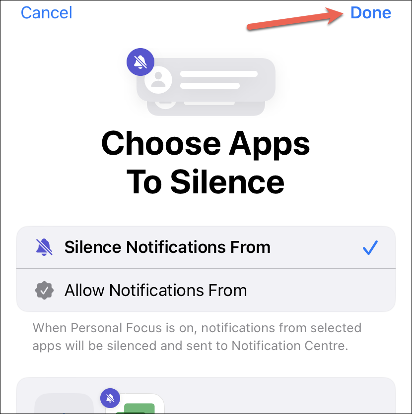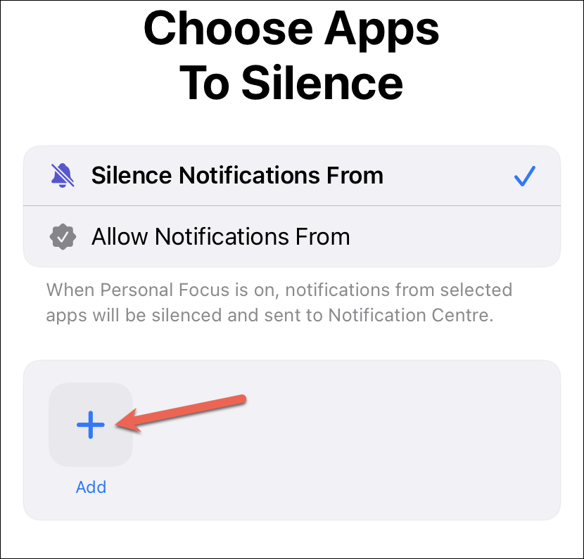 Tap ‘Add’ and select the apps you want to add to the silence list. Notifications from selected apps will go straight to the notification centre when this particular Focus is on.