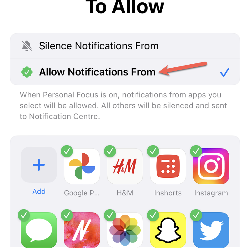 To have an ‘Allow’ list instead, change the selection to ‘Allow Notifications From’ and notifications will only be allowed from all the apps you have added and the rest will be silenced. iOS will suggest some apps to allow when setting up a particular Focus for the first time; you can keep them or unselect them and choose the apps on your own.