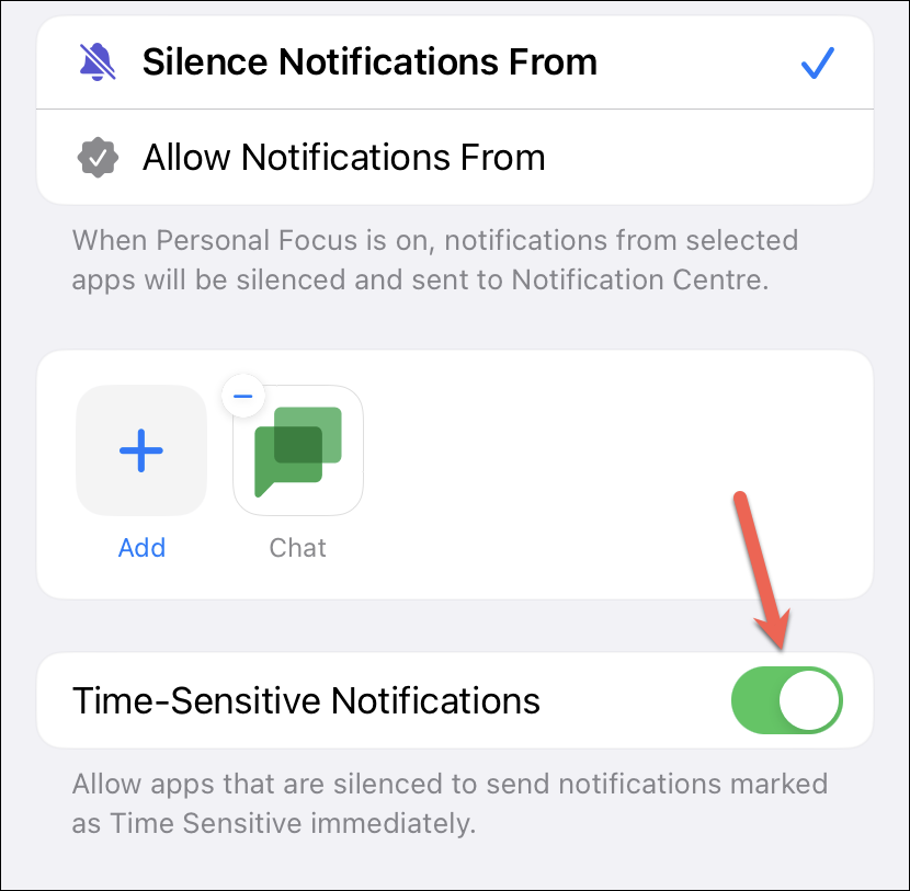 To allow time-sensitive notifications from the apps you have silenced, enable the toggle for ‘Time-Sensitive Notifications’. Otherwise, keep it disabled.