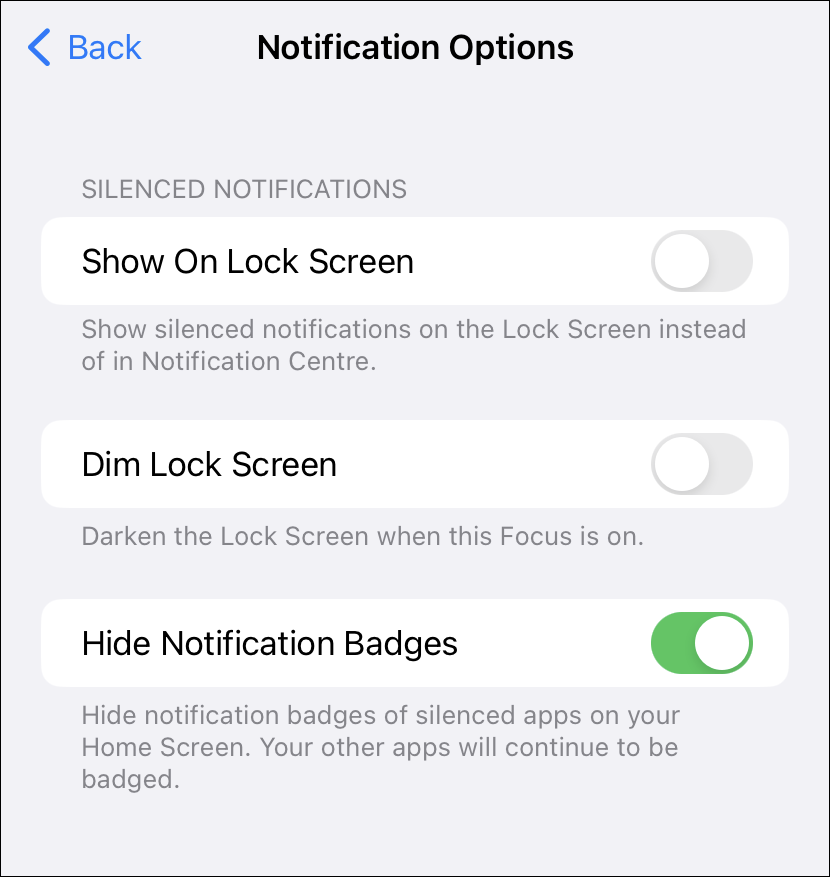 Here, you can choose to display the silenced notifications on the lock screen instead of the notification centre, dim the lock screen when the focus is on, and select whether you want the silenced apps to show notification badges.