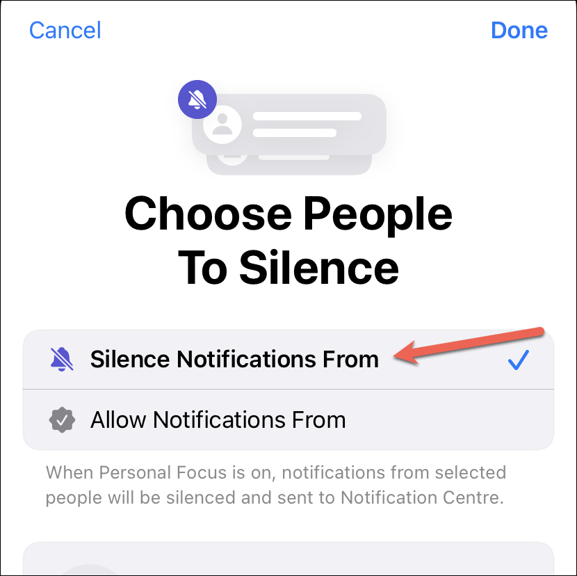 Now, in the new setup, you can either have a silence list or an allow list. To silence notifications from specific people while allowing them from all others, select the ‘Silence Notifications From’ option.