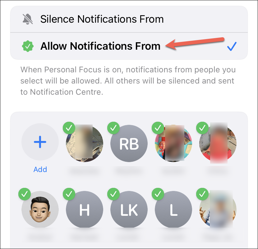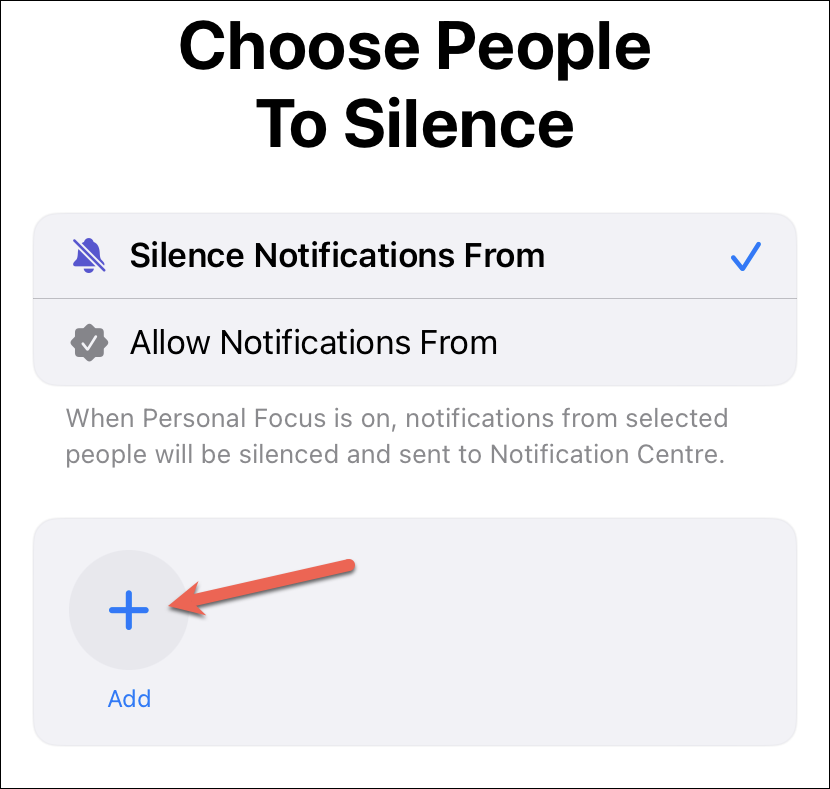 Then, tap the ‘Add’ option and select the contacts you want to silence the notifications from when the Focus in question is active.