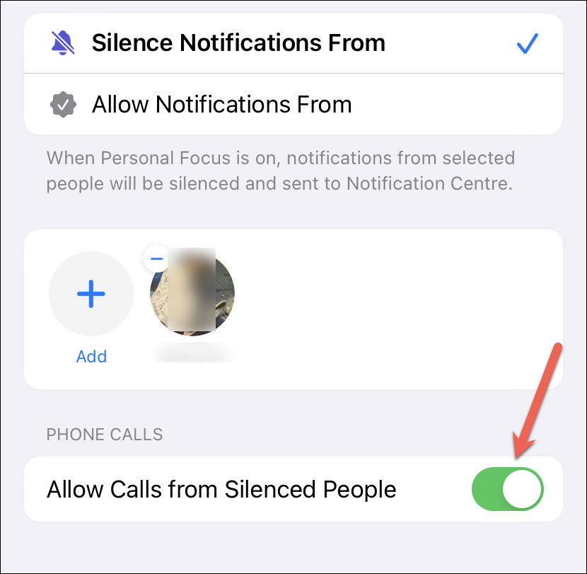 If you only want to silence message notifications from people in the list, but want their calls to get through, enable the toggle for ‘Allow Calls from Silenced People’, otherwise leave it disabled.