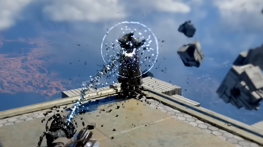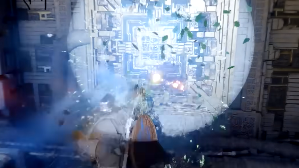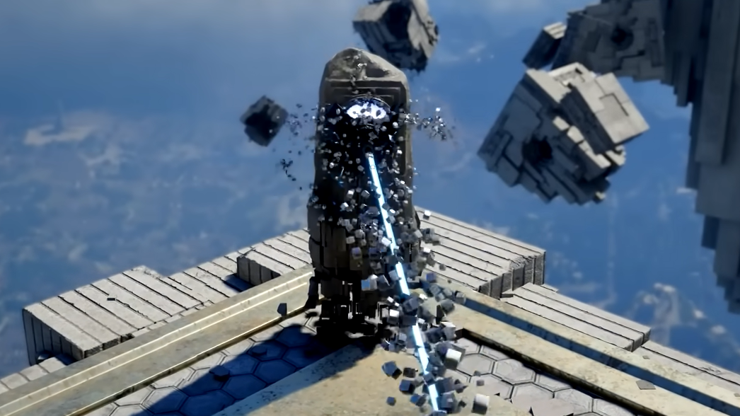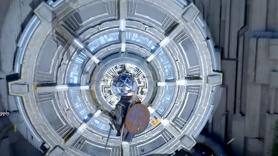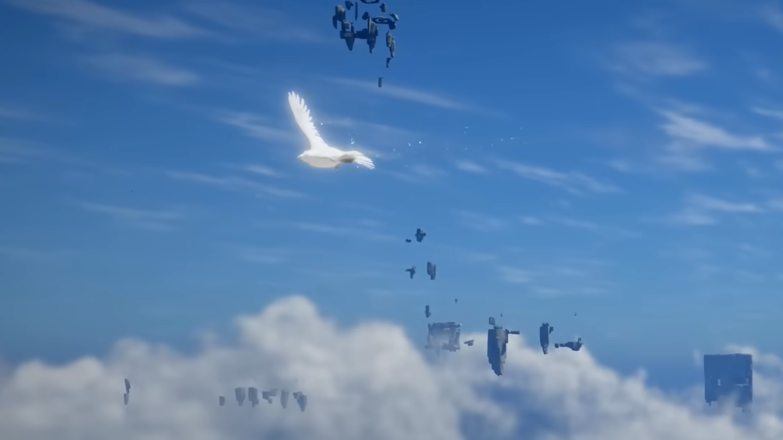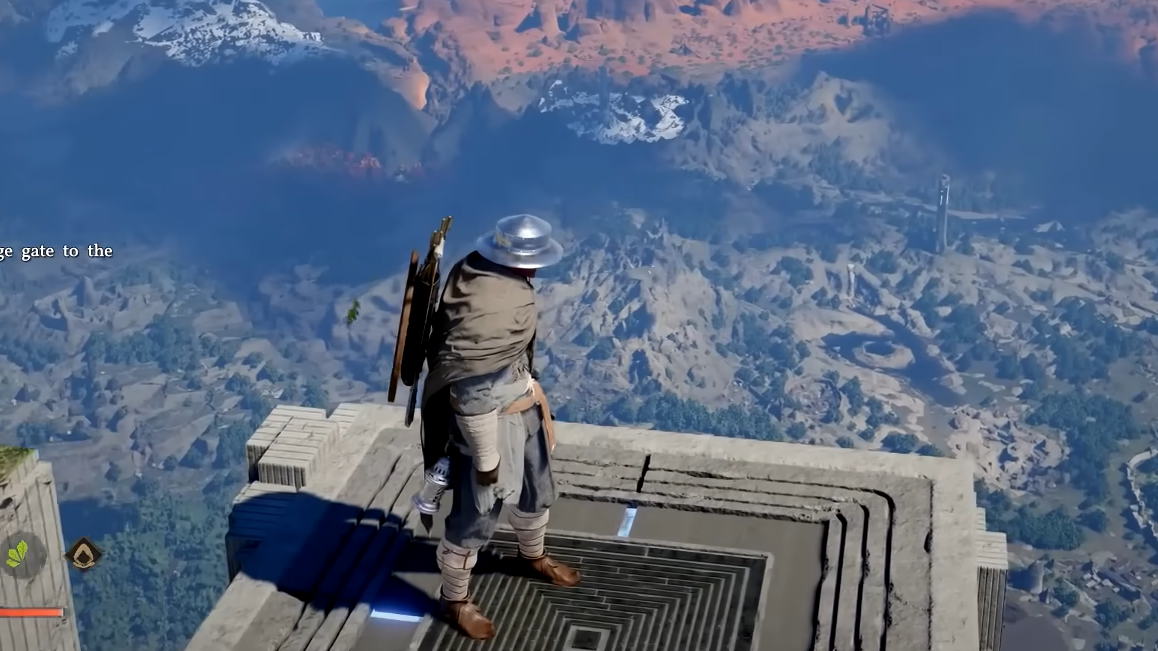 At the top of the platforming section, look for a platform to the right that you can jump down to. Stand in its center to activate a teleporter that sends you to a distant island. Continue forward until you reach a large open courtyard area.