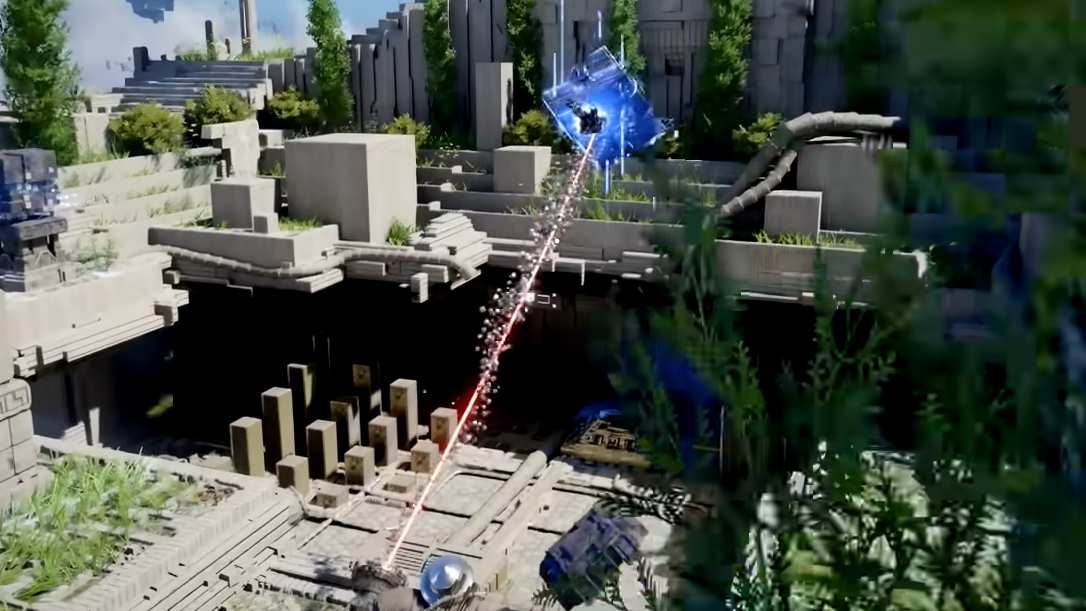 Step 1: Hold Tab (or L3) to aim Axiom Force at the blue floating cube in the middle of the area. Grab it and drag it over to the right pedestal — the deactivated lantern. Placing the cube there removes the barrier blocking the floor below.